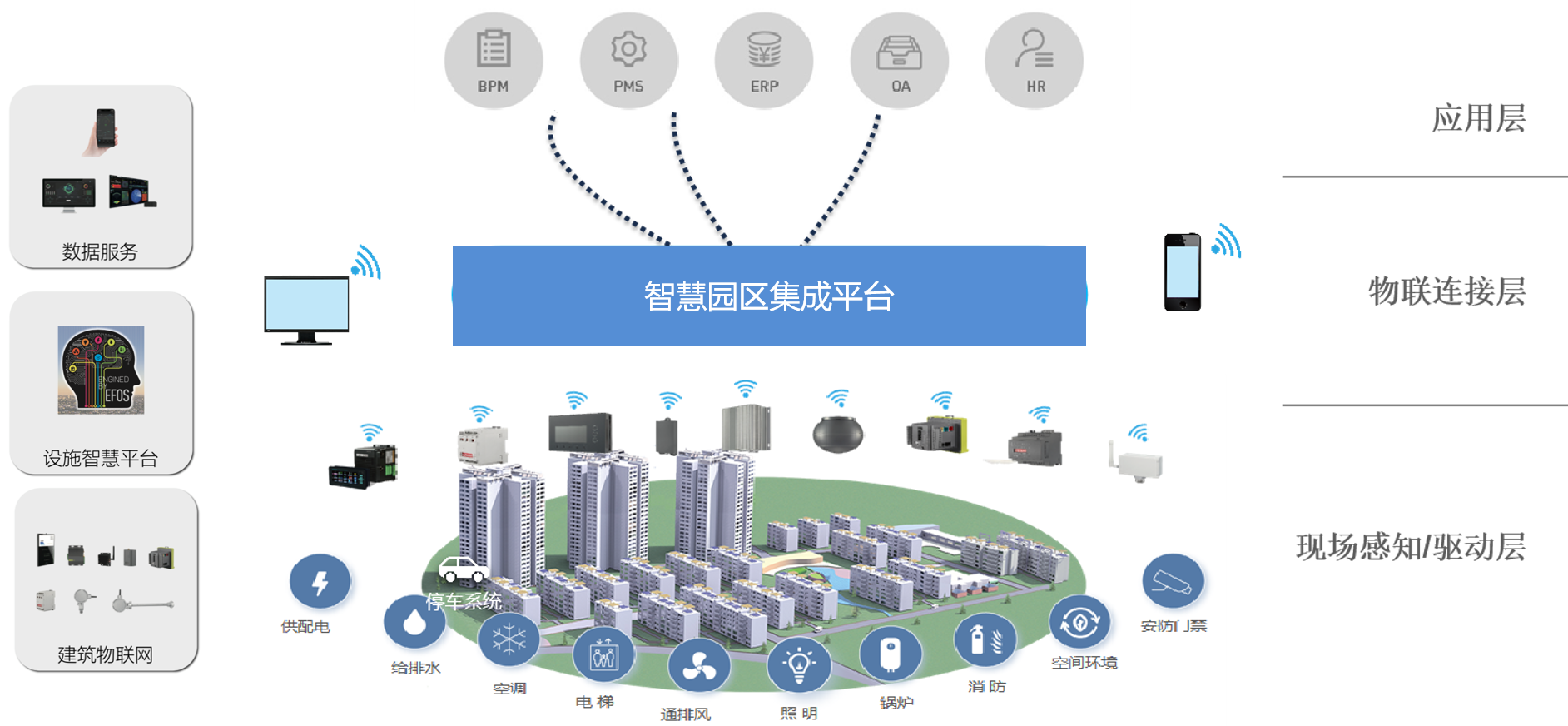 通過智慧園區(qū)集成平臺實現(xiàn)辦公、黨政、通行、企服、安防、消防及物聯(lián)網(wǎng)等多系統(tǒng)、場景的互聯(lián)互通。